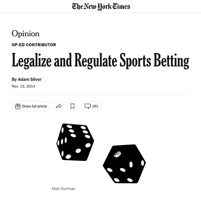 到了2014年,亚当-萧华接过了大卫-斯特恩的权杖,成为了NBA总裁,他在《纽约时报》发表了一篇署名文章,标题就是“体育博彩的合法化和规范化”。