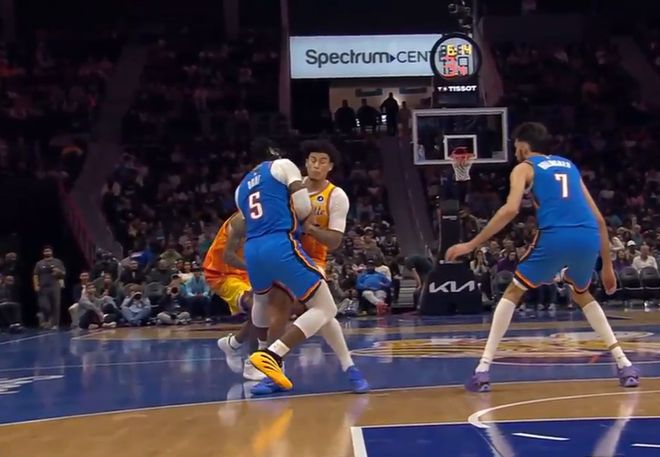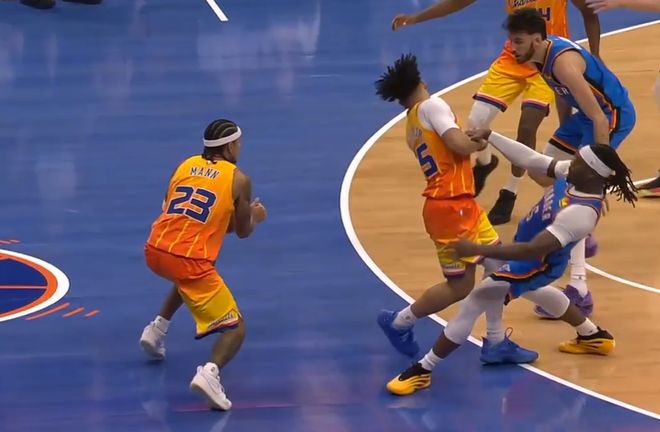 第四节决战,克尼普尔运球借挡拆,45度自信干拔出手三分命中,小米切尔接球突破,迎着防守高弧度抛投打进2+1,立马回应。锡昂·詹姆斯迎着防守强投三分命中,KJ-辛普森连续中距离跳投命中,黄蜂一波流将分差缩小至14分,只可惜时间所剩无几,最终,雷霆客场109-96轻松击败黄蜂,豪取5连胜。