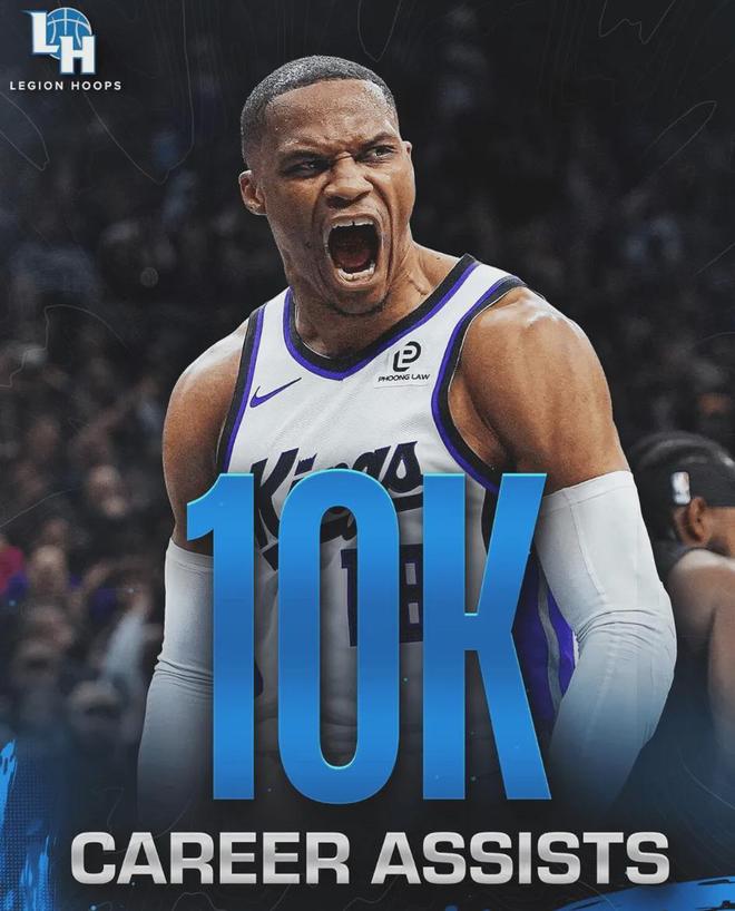 在比赛的第三节,威少爷送出了个人本场第7次助攻,至此他的NBA生涯总助攻数突破了10000次,升上NBA历史助攻榜第8位。