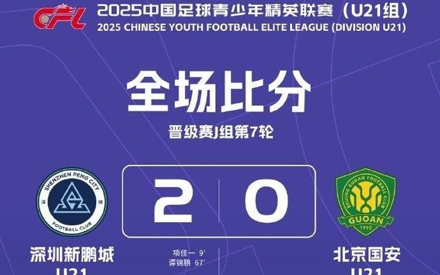 中青赛U21组晋级赛J组第7轮赛果:新鹏城20国安、浙江10河南