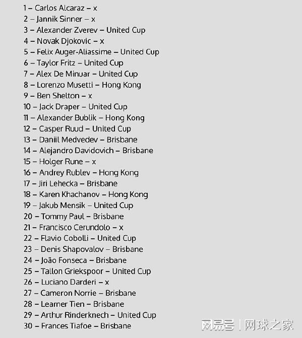 2026赛季再有不到三周就要拉开大幕了。那么新赛季的首周,ATP的高排位球员都有哪些赛程安排呢?有国外的球迷制作了一张表,把TOP30球员的赛程都列了进来,方便球友了解。在TOP30球员当中,有23位球员选择在新赛季首周就参加巡回赛的赛事,主要集中在联合杯混合团体赛、ATP250布里斯班站和香港站。其他几位球员,有因伤处于康复期的,有去打表演赛的,还有选择不参赛的。