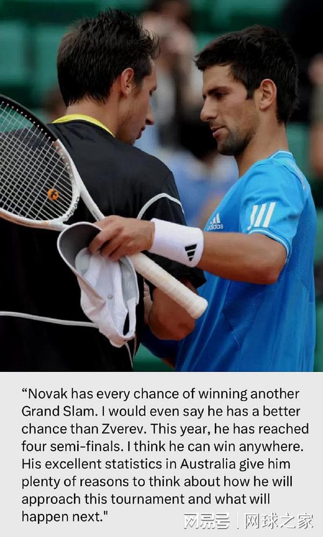 我们再来关注德约科维奇。近日,已经退役的乌克兰球员斯塔霍夫斯基在访谈节目中表示,他坚信德约科维奇能拿到大满贯第25冠,而且认为目前的塞尔维亚人在大满贯赛事中夺冠的机会大于世界第三、德国人小兹维列夫,“诺瓦克再拿一个大满贯的机会非常大。我得说,他比兹维列夫拿到大满贯的机会更大,他今年四大满贯都打进了四强,所以我觉得他在哪里都能夺冠。他在澳大利亚的辉煌纪录,让他有充分理由去考虑备战计划,并对结果抱以期待。”
