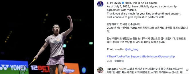 今年年初,韩国羽协正式开放运动员个人赞助权益,安洗莹选择与尤尼克斯签约。据韩国媒体透露,这份合同总价值达100亿韩元(约合人民币5300万元),合同期限为4年,刷新了全球羽毛球运动员的赞助纪录。此外,韩国羽毛球运动员徐承宰、金元昊也与尤尼克斯签订了赞助合约,部分选手则签约了威克多。