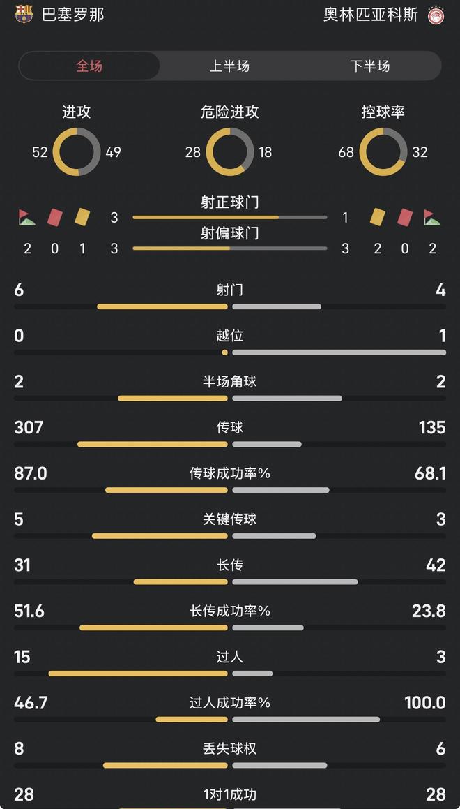 雷速体育10月22日讯 欧冠联赛阶段第三轮,巴萨坐镇主场对阵希腊球队奥林匹亚科斯。半场战罢,巴萨暂时以2-0的比分领先对手。