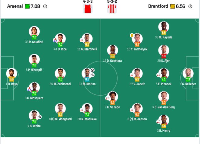 阿森纳首发:1-拉亚、4-本·怀特、3-莫斯克拉(43’12-廷伯)、5-因卡皮耶、33-卡拉菲奥里、41-赖斯(83’14-约克雷斯)、36-苏维门迪、8-厄德高、20-马杜埃凯(61’7-萨卡)、11-马丁内利(61’10-埃泽)、23-梅里诺。